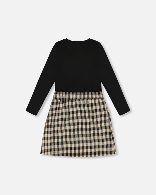 Kids Bi-Material Dress With Bow Plaid Black And Beige