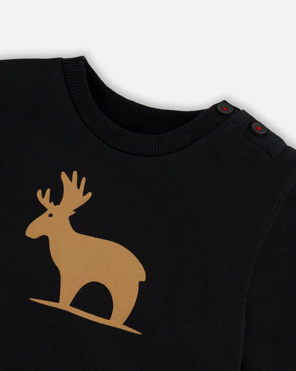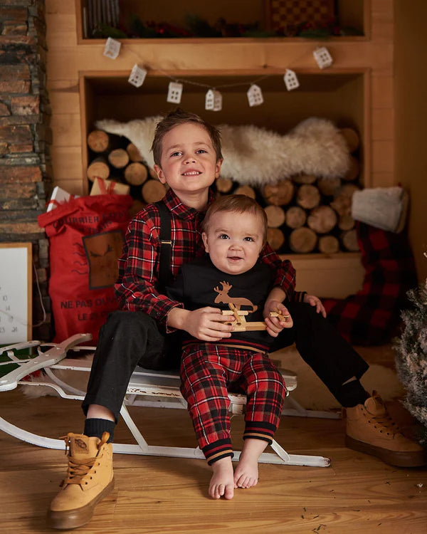 With a plaid and reindeer motif, our Fleece Sweatshirt and Pant Set Plaid Black and Red is holiday perfection! This adorable two-piece set features a long sleeve cotton/poly fleece top with a round neckline, a reindeer graphic, button closures, and striped rib knit trim. We've teamed it with a bold plaid cargo pant with a loose fit and striped elastic ribbing at the waist and ankles