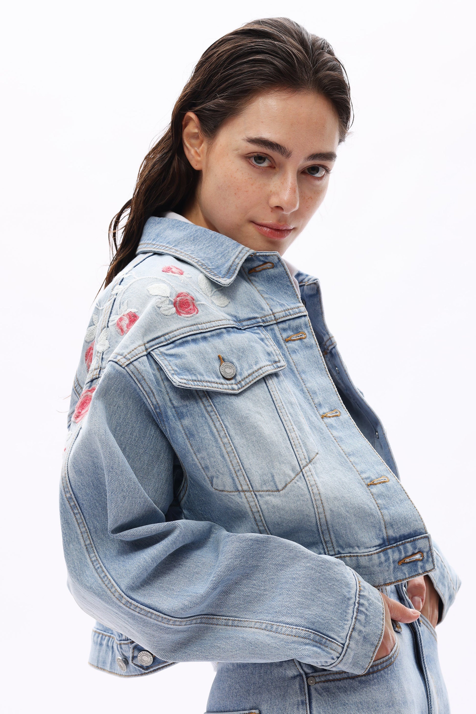 Trend-right and versatile, this cropped jacket features vibrant floral embroidery, bringing a unique and stylish flair to your outerwear collection.