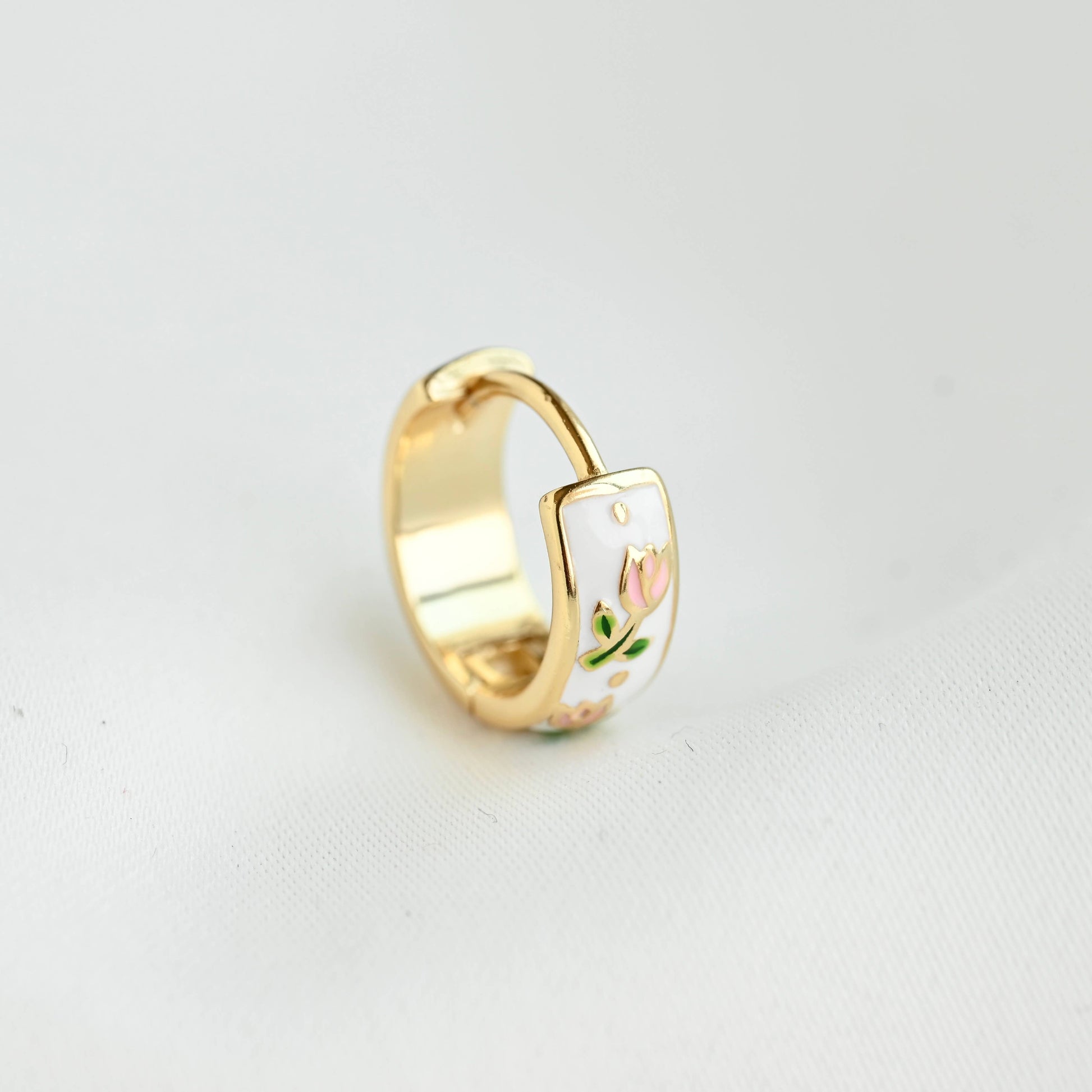 Delicate and charming, these 12mm huggie hoops feature soft pink tulips on a glossy white enamel background. Crafted from sterling silver with a 5mm width, they add a touch of floral sweetness to any outfit, perfect for everyday wear or gifting.