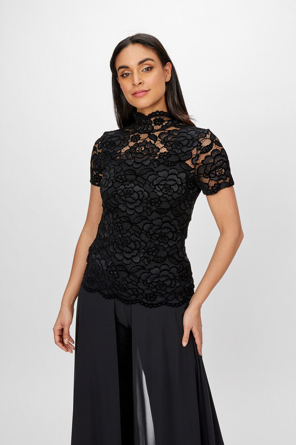 Experience the elegance of the Frank Lyman pullover, a chic and feminine piece designed for semi-formal occasions and night outs. This hip-length, fitted pullover features a high neck and short sleeves, adorned with a delicate lace floral pattern and a scalloped hem. Perfectly blending style and sophistication, it’s a must-have for any wardrobe.