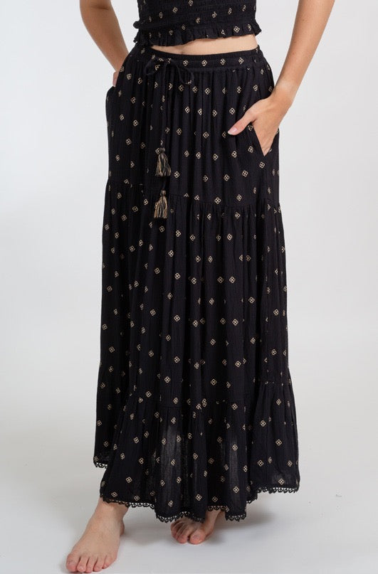 Longline, floaty, and seriously flattering, step out in style this spring & summer season with this romantic boho inspired maxi skirt. With a delicate gold print detail and tiered style, this long skirt is the perfect way to max out your look. Whether you're heading on a girls day out or on the hunt for the perfect summer outfit, we've got you covered. Just pair with some sandals and the Miami Shine Crop Top and you're good to go!